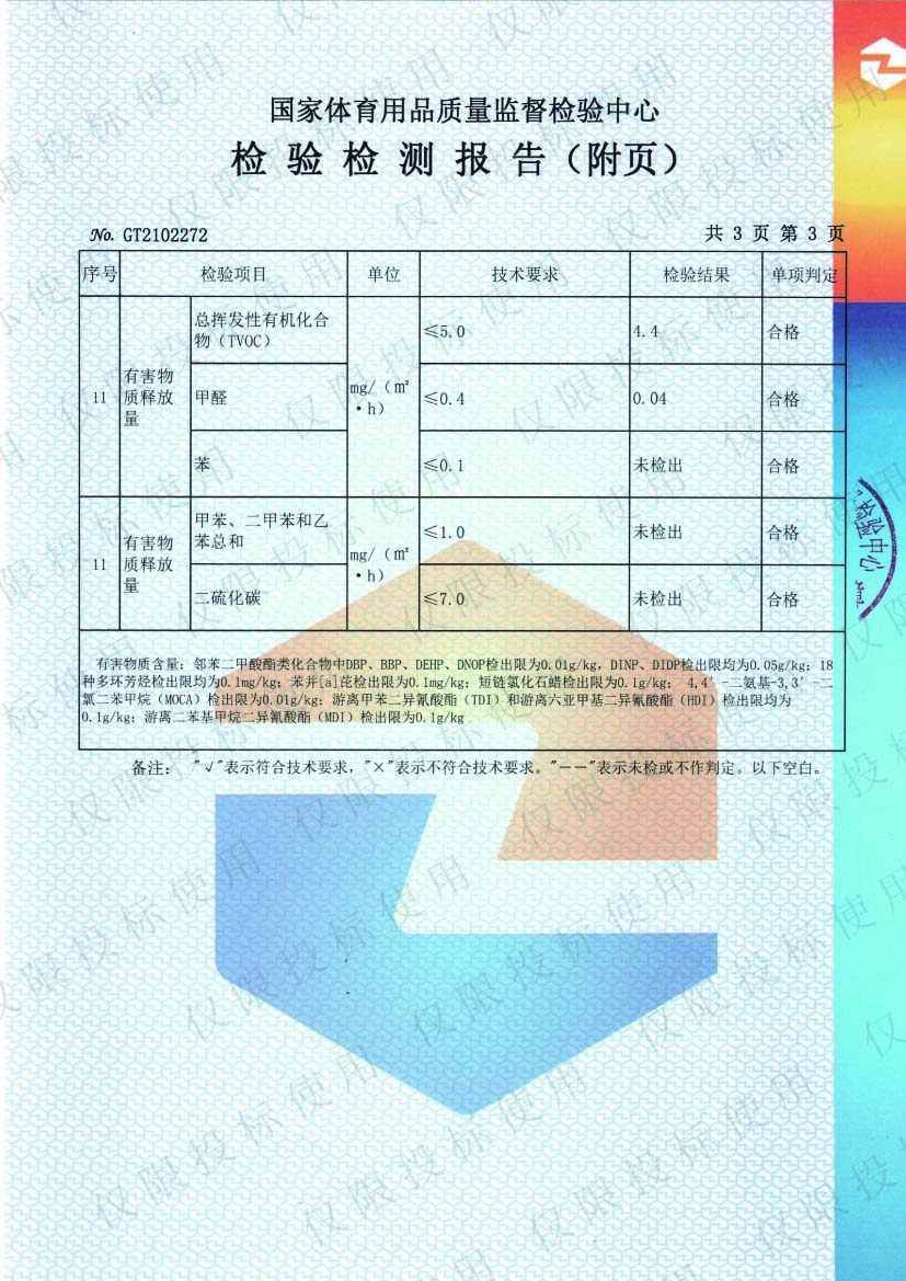 采用優(yōu)質(zhì)PVC原生料,環(huán)保增塑劑,無甲醛、無重金屬等有害物質(zhì),地板環(huán)保安全,保障健康運(yùn)動(dòng)環(huán)境。