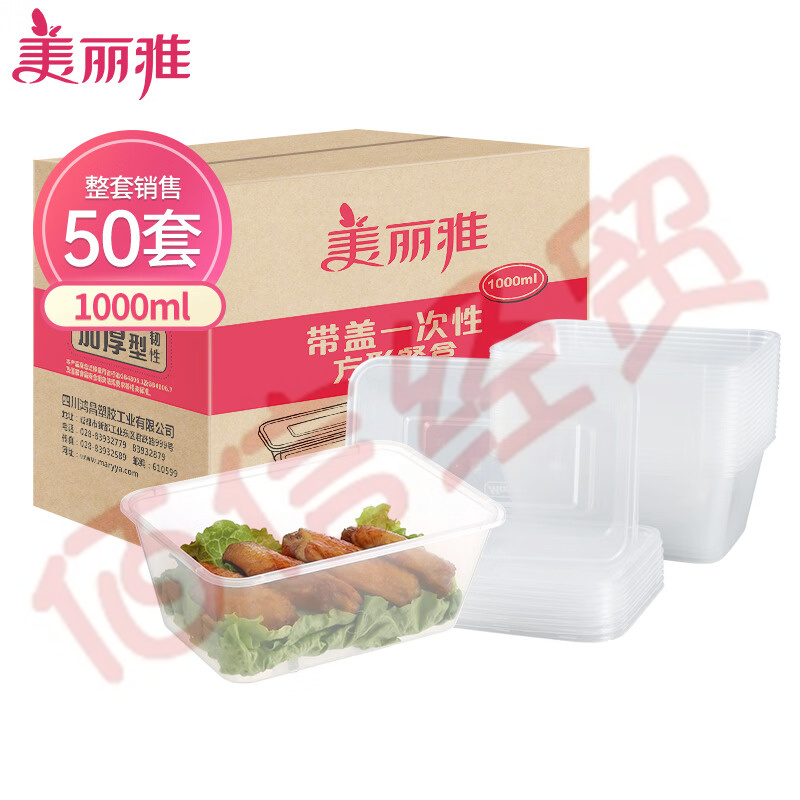 美麗雅 一次性快餐盒方形1000ml*50套外賣打包盒飯盒便當(dāng)野餐湯碗水果加厚帶蓋塑料保鮮盒批發(fā)可微波爐(5個起售) 自營