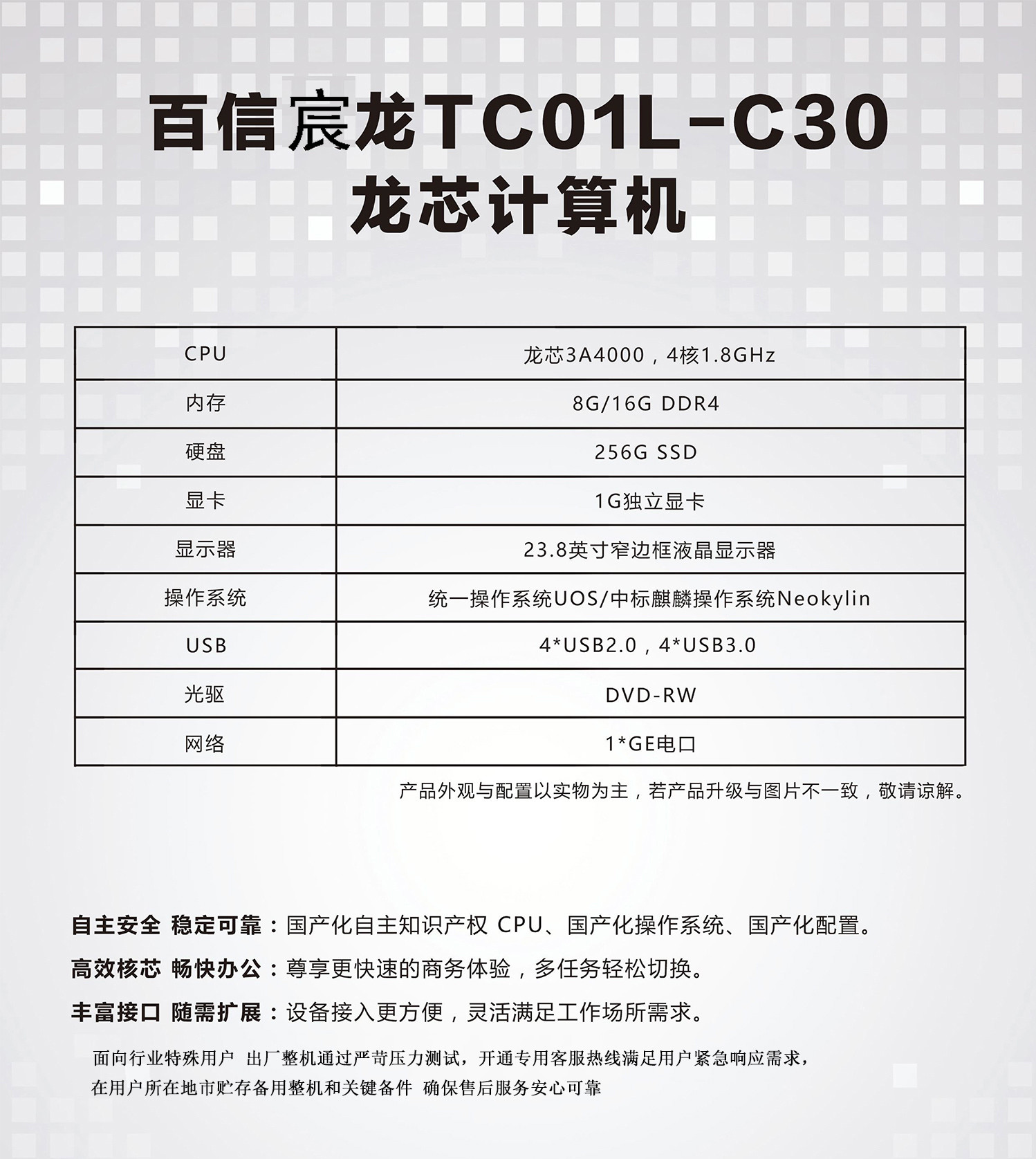 百信宸龍TC01L-C30 商用國產(chǎn)臺式電腦 龍芯3A 4000/8G /256SSD /1G /DVDRW /單主機(jī)(預(yù)計統(tǒng)信試用系統(tǒng)) 自營