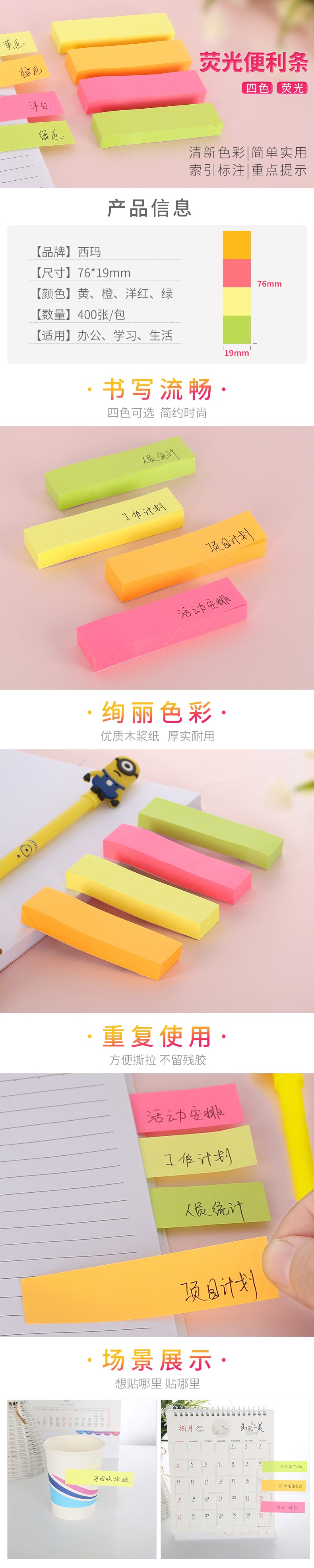 西瑪(SIMAA)400張4色便利貼熒光小條便簽紙 76*19mm記事貼N次貼 學生留言8452(10個起售) 自營
