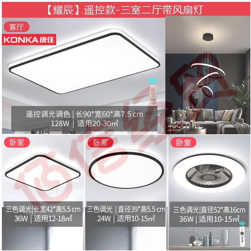 康佳(KONKA)LED客廳燈北歐簡約大氣臥室吸頂燈 三室二廳(帶風(fēng)扇) 自營