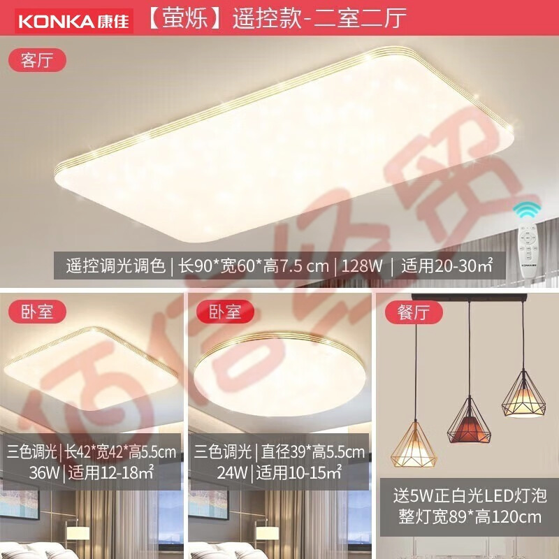 康佳(KONKA)客廳燈臥室護(hù)眼吸頂燈書房兒童房防藍(lán)光防頻閃led 2室2廳 自營