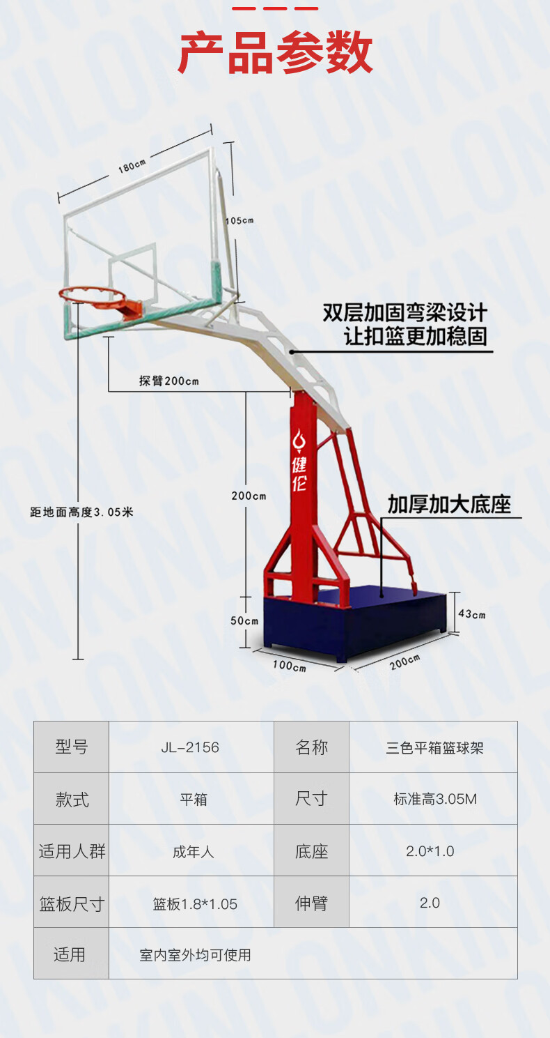 健倫(JEEANLEAN)JLAA160籃球架 標(biāo)準(zhǔn)成人戶外移動 三色仿液壓籃球架/單只 自營