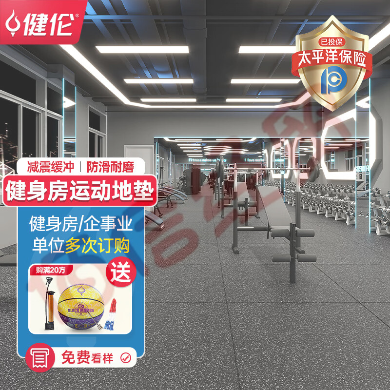 健倫健身房地墊隔音減震墊樓層靜音家用地板地膠運動50*50*4.5帶槽款 自營