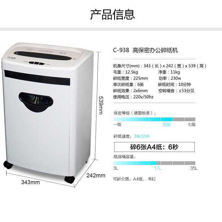 科密(comet)5級保密辦公商用碎紙機(jī)(單次6張持續(xù)10分鐘17L)C-938 自營