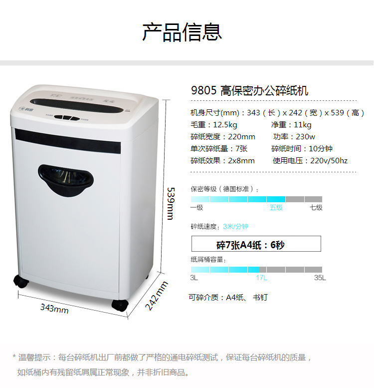 科密(comet)9805 5級保密辦公商用碎紙機(單次7張 持續(xù)10分鐘 17L) 自營
