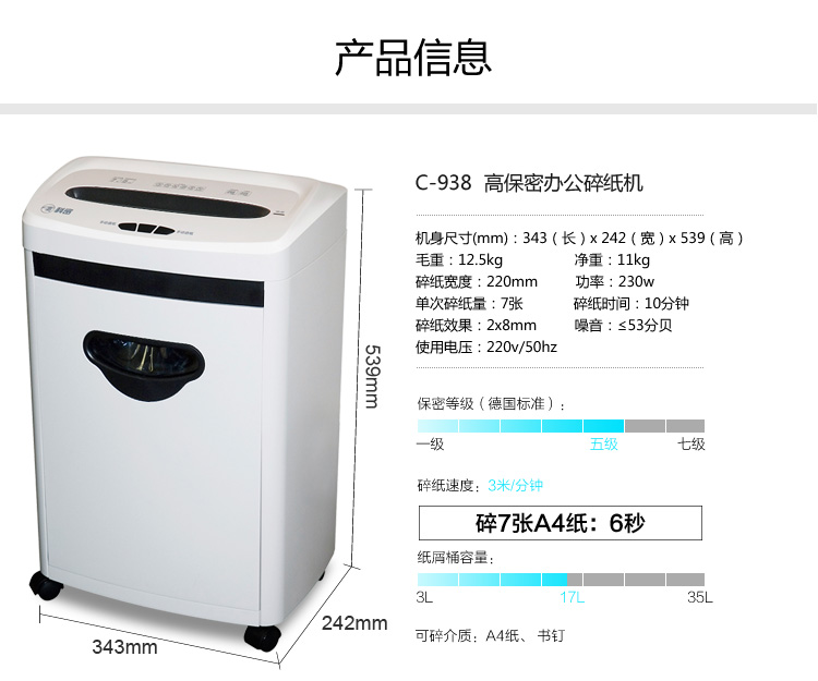 科密(comet)c-938 5級保密辦公商用碎紙機(jī)(單次6張 持續(xù)10分鐘 17L ) 自營